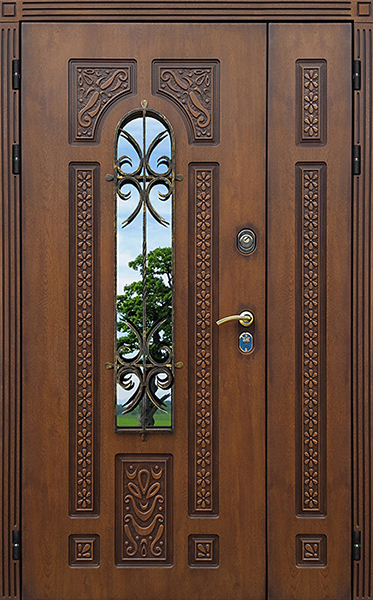 Двойная входная дверь с большим стеклом и ковкой для дома №25 сочетает в себе стиль и надежность, предлагая великолепное решение для вашего дома. Внешняя и внутренняя отделка выполнены из панелей МДФ с ПВХ, что придает двери долговечность и устойчивость к механическим повреждениям, а также способствует легкости ухода. Стеклопакет в комбинации с изысканным кованым узором создаёт не только эстетическое наслаждение, но и позволяет улучшить светопроникновение в помещении. Двойная входная дверь с большим стеклом и ковкой для дома №25 от производителя: быстрое изготовление и монтаж в Красногорске, индивидуальные размеры, широкий выбор материалов и фурнитуры, официальная гарантия до 10 лет.