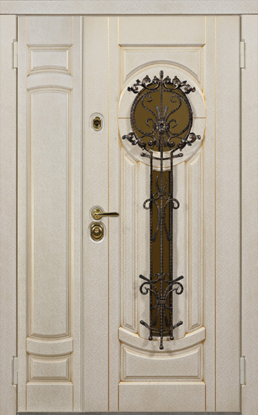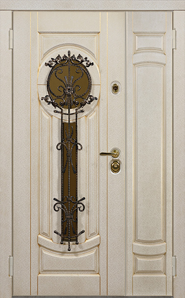Двухстворчатая парадная дверь с ковкой и стеклом белая №30 — это сочетание красоты и надёжности. Конструкция из профильной трубы 50х25 мм и металлического листа толщиной 2 мм обеспечивает долговечность и стойкость к внешним воздействиям. Элементы ковки придают двери изысканный вид, а стеклопакет позволяет создать атмосферу лёгкости и прозрачности. Внешняя и внутренняя отделка выполнены из плиты МДФ, что делает дверь не только привлекательной, но и устойчивой к механическим повреждениям. Для дополнительной герметичности используются уплотнители с двумя контурами, а блокираторы обеспечат безопасность. Вариативность размеров и возможность добавления дополнительных опций, таких как шумо- и теплоизоляция, делают эту модель универсальной для установки в любом интерьере. Двухстворчатая парадная дверь с ковкой и стеклом белая №30 от производителя: быстрое изготовление и монтаж в Красногорске, индивидуальные размеры, широкий выбор материалов и фурнитуры, официальная гарантия до 10 лет.