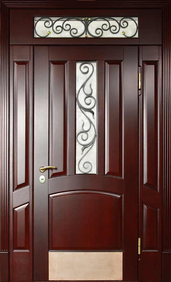 Красивая шпонированная дверь с надежной фурнитурой и ковкой "лоза" №33 идеально дополнит интерьер вашего частного дома или коттеджа. Внешняя и внутренняя отделка выполнены из натурального дерева, что придает двери элегантность и стиль. Профильная труба 50х25 мм используется для каркаса и полотна, а лист металла толщиной 2 мм и ребра жесткости из профильных труб 40х25 мм обеспечивают прочность и долговечность. Несмотря на отсутствие терморазрыва, дверь гарантирует надежную защиту и теплоизоляцию благодаря двум контурам уплотнения. Элементы ковки "лоза" придают двери особое очарование, сочетая практичность с эстетикой. Эта дверь — идеальный выбор для тех, кто ценит стиль, качество и безопасность. Красивая шпонированная дверь с надежной фурнитурой и ковкой "лоза" №33 от производителя: быстрое изготовление и монтаж в Красногорске, индивидуальные размеры, широкий выбор материалов и фурнитуры, официальная гарантия до 10 лет.